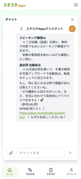 スタスタAppsは、解答速報〈自己採点シート〉、過去問 自動採点、ライティングAI採点、WPM計測テストなど、学習支援機能を継続的にアップデートしています。