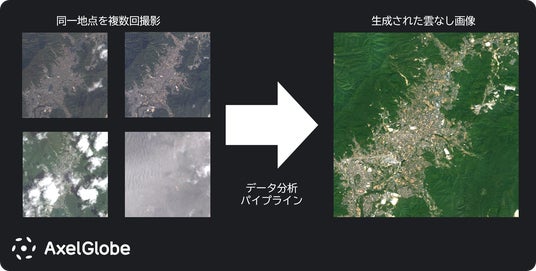AxelGlobeモザイクによる雲なし画像の生成例。GRUSにより撮影した複数の衛星画像(左)から雲なし画像を合成する。