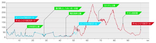 7月15日(火)から募集を開始する「ファンライド」は、ロングコース「チャレンジ100」(約100km、獲得標高1300m)と、初心者でも安心のショートコース「エンジョイ50」(約50km、獲得標高500m)の2種類のコースが用意されています。