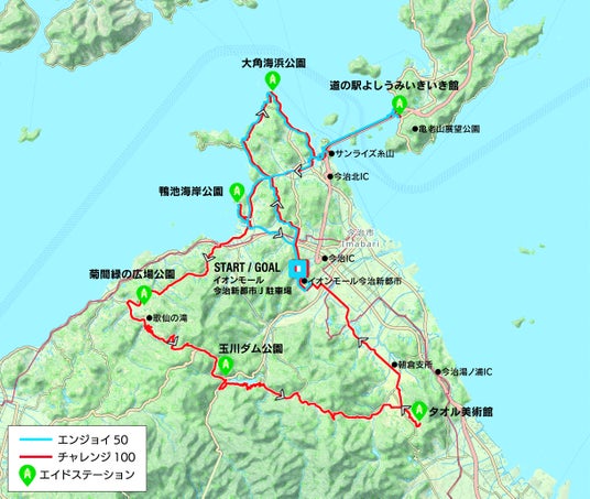 「チャレンジ100」は、最大標高差約350mの峠や勾配10%以上の坂道を越えていく、いわゆる”ガチ勢”向けのコース設計。一方の「エンジョイ50」は、要所に坂道があるものの、長距離走行に自信がない方でも楽しんでいただけます。どちらのコースにも、地元食材を使ったカレーにパン、スイーツなど、今治ならではのグルメが楽しめるエイドステーションを設けています。さらに、フィニッシュ会場では、合併20周年記念事業で考案されたオリジナルおむすびも提供します。