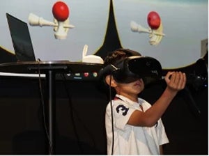 VRゴーグルを装着し、けん玉ゲームを体験する様子