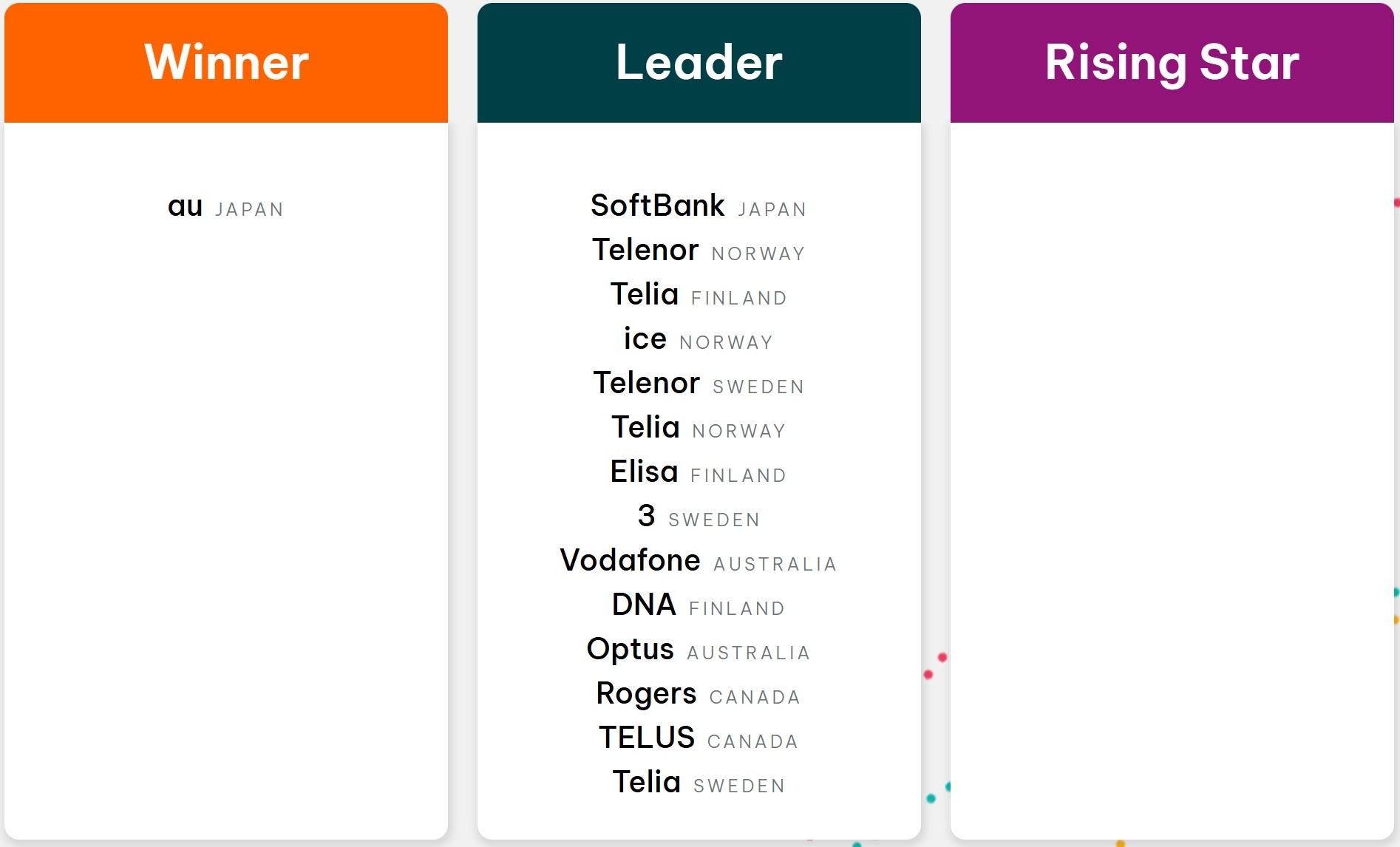 Opensignalは、各指標・各ランドエリア区分ごとにトップ・スコアのオペレーターを「グローバル・ウィナー/グローバル・リーダー」として表彰しました。