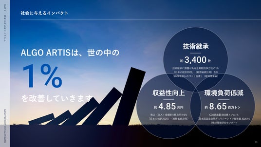 株式会社ALGO ARTIS(本社:東京都港区、代表取締役社長:永田 健太郎、以下、ALGO ARTIS)は、事業活動を通じた社会課題への貢献や、取り組みの成果をまとめた「Impact Report(インパクトレポート)2025」を発行しました。
