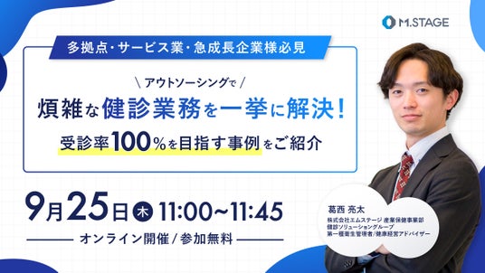 株式会社エムステージ(本社:東京都品川区、代表取締役:杉田雄二)産業保健事業部は、9/25(木)11時より、健康診断業務の課題解決をテーマに、アウトソーシングによって工数削減、受診率アップを実現した企業様の事例をもとに、アウトソーシングでできること、健康データを活用したその先の一手を解説するウェビナーを開催いたします。