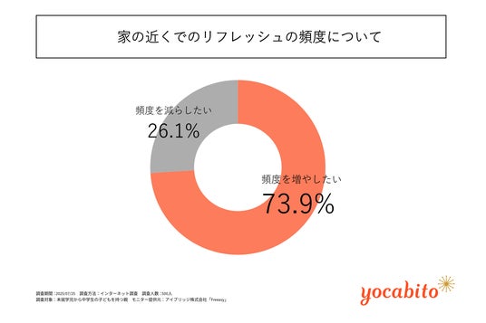 また、近所でのリフレッシュ頻度について『増やしたい』または『減らしたい』と回答した人に絞って内訳を見ると、73.9%が『増やしたい』と回答しており、現状の頻度に満足していない層の多くが、より多くの時間を求めていることが分かりました。