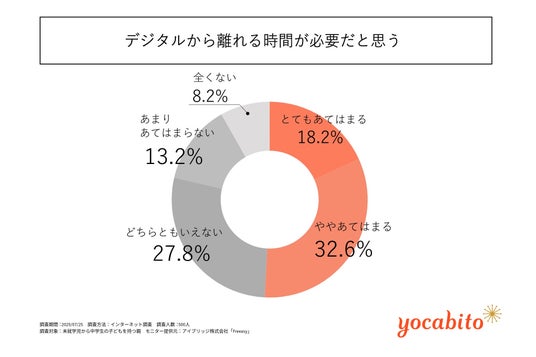 「毎日の余暇の充実で、豊かな人生を」をコンセプトとする大人向けレジャーブランド「yocabito」(株式会社YOCABITO)は、子育て世帯500名を対象に「親子でのリフレッシュ」に関する意識調査を実施しました。その結果、多くの親が手軽さからスマートフォンの利用に時間を費やす一方で、そこに罪悪感を抱き、またリアルな外出では身体的な負担を感じるなど、心から満たされる「余暇」を過ごせていない実態が明らかになりました。愛知県豊明市では全国初の「スマホ1日2時間」条例案が提出されたりと、デジタルデバイスとの付き合い方はは社会全体の関心事となっています。単にスマホから時間を引き離すだけでは、解決できない「お出かけの課題」が本調査で見えてきました。