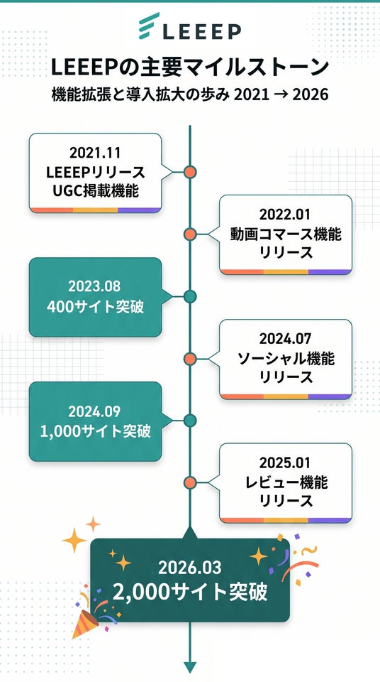 LEEEPは、2021年11月の提供開始以来、UGC掲載機能を起点に、動画コマース機能、ソーシャル機能、レビュー機能へと展開しながら、ブランドの魅力や世界観、商品の信頼性がより自然に伝わるEC体験の実現を支援してまいりました。今回の2,000サイト突破は、LEEEPがECサイト上の多様な顧客接点を支える統合プラットフォームとして着実に広がってきたことを示す、大きな節目であると捉えております。