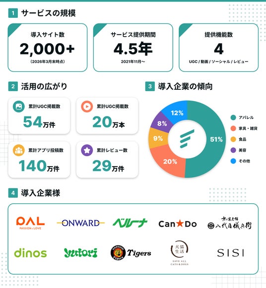 LEEEPのこれまでの成長を、主要な数値で振り返ります。2021年11月のサービス開始から約4年半で導入サイト数は2,000を突破し、累計で54万件以上のUGCや20万本以上の動画がECサイト上に掲載されてきました。業種別ではアパレルが全体の約半数を占めるほか、食品・美容・インテリアなど多様な業界でご活用いただいています。
