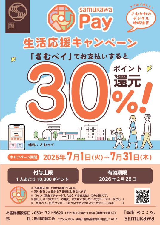 さむかわPayは、寒川町内の加盟店で使用できる地域活性化を目的としたキャッシュレス決済アプリです。今回のキャンペーンは物価高騰に対して生活を応援することを目的としています。町内の人だけでなく、町外の人でも寒川町の加盟店で、さむかわPayを使って買い物や食事等をすると30%分のポイント(1人あたり最大で10,000ポイント)が還元されます。