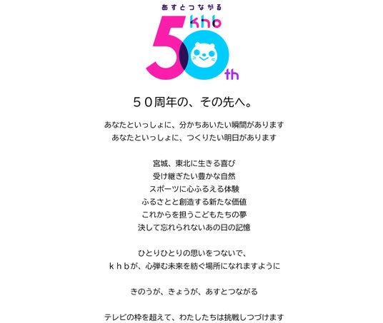 khb東日本放送(本社:仙台市太白区)は、2025年10月1日に開局50周年を迎えます。本日から一年間を開局50周年期間として、番組やイベントなどさまざまなコンテンツをお届けしてまいります。この度、50周年特設サイトと本日から放送を開始する50周年ムービーを公開しました。合わせてぜひご覧ください。