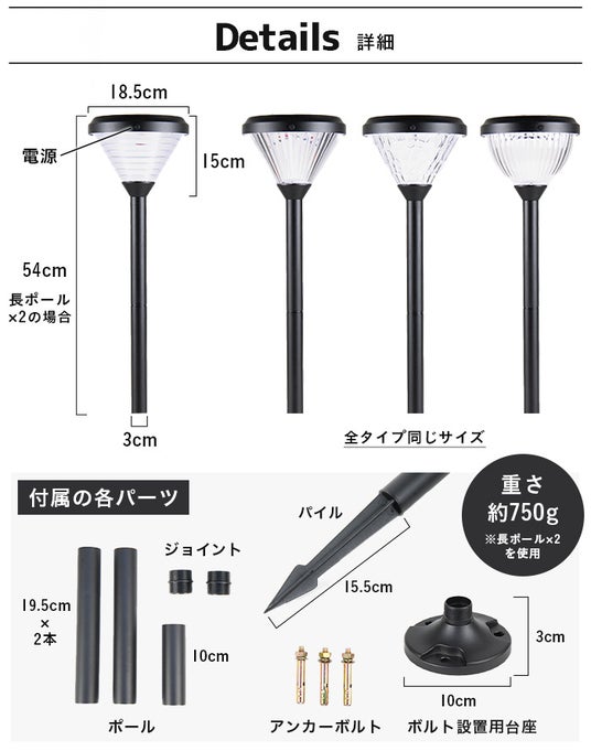 サイズ:ランプ本体 直径18.5cm 高さ15cm / 長ポール2本 高さ19.5cm / 短ポール 高さ10cm / 台座 直径10cm 高さ3cm / パイル 高さ15.5cm