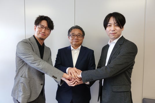 (左から)OutNowの荻田魁取締役、朝日新聞社の角田克代表取締役社長CEO、OutNowの濱本至代表取締役
