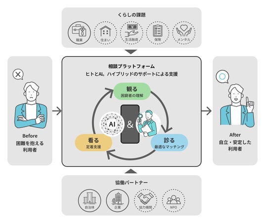「誰もが夢を見られる社会へ」というビジョンのもと、相談ノウハウとテクノロジーを融合させた相談プラットフォームを通じて、孤立を解消し、必要な情報や支援を届けることで、一人ひとりが安定した経済基盤を築き、将来の“なりたい自分”を実現できる社会を目指しています。