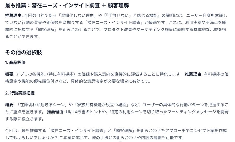 設問案だけではなく、リサーチの目的、ターゲット、リサーチを通じて得られる示唆などを整理したリサーチ方針(コンセプト)もセットで生成されるため、社内でのコミュニケーションやレビュー時の効率化を図ることが可能です。