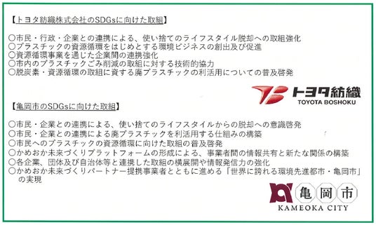 この度、この主旨に賛同していただいたトヨタ紡織株式会社(カーボンニュートラル環境センターCCNO:鈴村浩己氏)と、「かめおか未来づくり環境パートナーシップ協定」を締結し、市中から廃棄物として回収されたプラスチックを自動車部品に活用するための技術検証に連携して取り組みます。