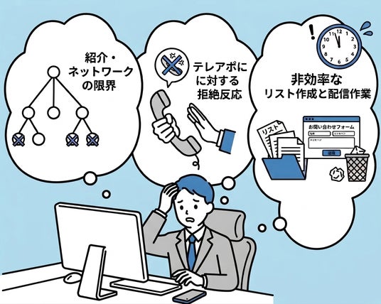 M&A市場の拡大に伴い仲介会社間の競争が激化する中、多くの企業が直面しているのが「売り手企業の開拓」という課題です。都内でM&Aアドバイザリー事業を営むF社も、紹介頼みの営業では月に数件の面談が限界でした。テレアポも試みましたが、M&Aという繊細なテーマに対する経営者の警戒感は強く、アポ率は極めて低い状況が続いていました。また、問い合わせフォームへのアプローチは決裁者の目に届きやすく手応えがあったものの、従業員数が6名のF社では、手作業×少人数体制でスケールさせることが困難でした。