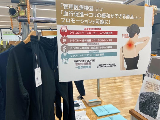 また、テキスタイル素材に加え、当社の製品ODM/OEM事業の一環として、着磁製品も出展いたしました。認証工場での生産のため、医療機器として販売可能であり、「血行促進」等の効果を謳った商品PRが可能となります。