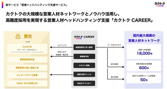 「カクトクCAREER」は、日本最大級の営業マッチングプラットフォーム「カクトク」で蓄積したナレッジとデータをもとに、企業のハイクラス営業職採用と候補者のキャリア形成を支援するサービスです。