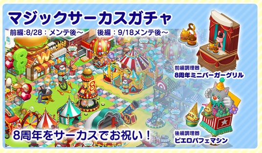 また期間中は、8周年を記念した「マジックサーカス」ガチャを開催。ここでしか入手できない調理器「8周年ミニバーガーグリル」や「ピエロマシン」などをゲットして、農場やお店をサーカスにカスタマイズできます。