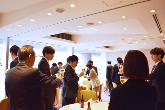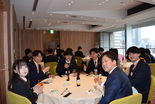 入社式終了後には、和気あいあいとした雰囲気の中でランチ会が開催されました。役員や先輩社員との親睦を深める場となり、新入社員たちはリラックスしたひとときを過ごしました。