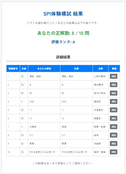 本サービスは、言語・非言語の基本問題を10問厳選し、本番に近い形式で出題しております。回答後には各問題の解説に加え、自分の評価ランクが表示されます。