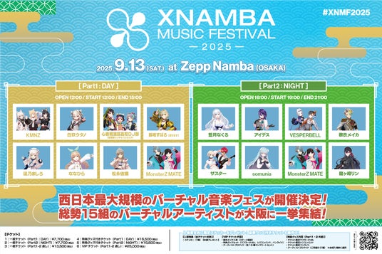 デジタル空間やeスポーツを活用して地域課題を解決する株式会社Meta Osaka(所在地:大阪府大阪市、代表取締役:毛利英昭)は、2025年9月13日(土)、Zepp Namba(所在地:大阪府大阪市)にて「XNAMBA MUSIC FESTIVAL-2025-」を開催いたします。YouTube総登録者数280万人超、X総フォロワー数77万人(出演15組の合計数 ※2025年8月時点)を誇るバーチャルアーティスト(VTuber)15組が一堂に会する音楽フェスティバルで、観客キャパ2500人規模でのバーチャル音楽フェスは西日本最大規模となります。5月27日に大阪・関西万博のEXPOホールで開催した「showcase」では、開演前から多数のファンが詰めかけ、学校帰りの高校生からファミリー層まで幅広い世代が来場し大きな反響を呼びました。