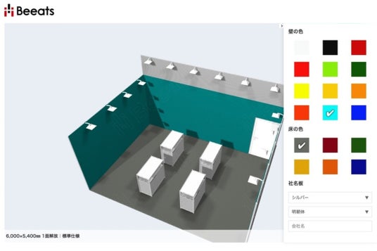 展示会出展を検討する企業の担当者が、希望するブースのサイズや開放面、構成タイプなどを選ぶことで、3Dパースイメージと概算費用が自動表示される仕組みです。床や壁の色、看板への社名反映も可能で、完成イメージを具体的に社内共有しやすくなります。