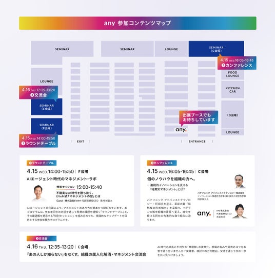 本企画では、株式会社EVeM 代表取締役CEO 長村禎庸氏をゲストに迎え、AIエージェント時代におけるマネジメントのあり方について、参加者との対話を交えながら議論します。加えてanyは、DAY1のカンファレンス登壇、DAY2の交流会、2日間を通したブース出展など、複数のコンテンツを通じてイベントに参画します。