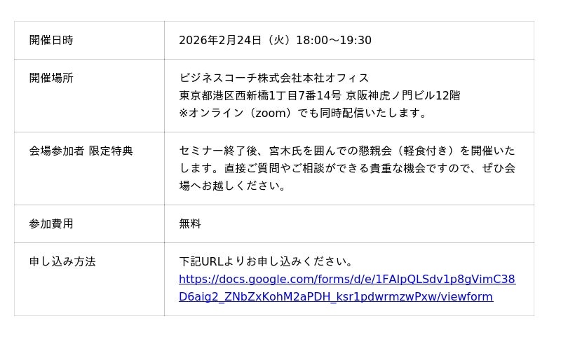 ビジネスコーチ株式会社(本社:東京都港区、代表取締役社長:細川 馨、東証グロース:9562)の子会社であるコーポレートコーチ株式会社(本社:東京都港区、代表取締役社長:森川 駿、以下当社)は、2月24日(火)に、一般社団法人ビジネスモデルイノベーション協会(BMIA)代表理事 コニカミノルタ株式会社 開発部長 Growth Works Inc. CEO 宮俊明氏をお招きし特別セミナーを開催いたします。