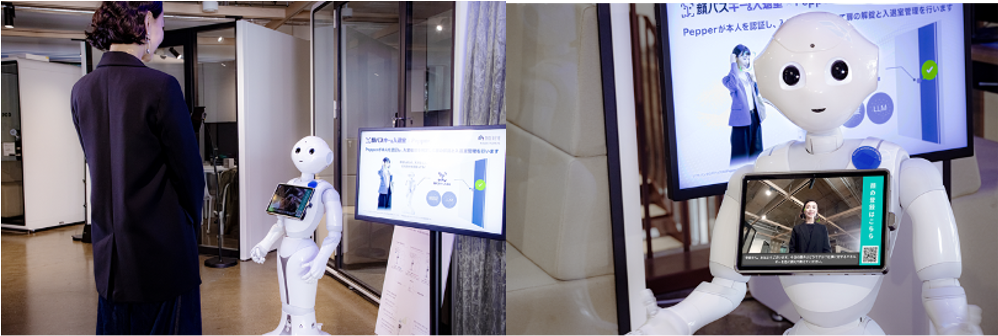 本ソリューションでは、企業のエントランスなどに設置された「Pepper+」が来訪者や社員の顔を認証し、認証結果に基づいた案内や受付対応を実行します。