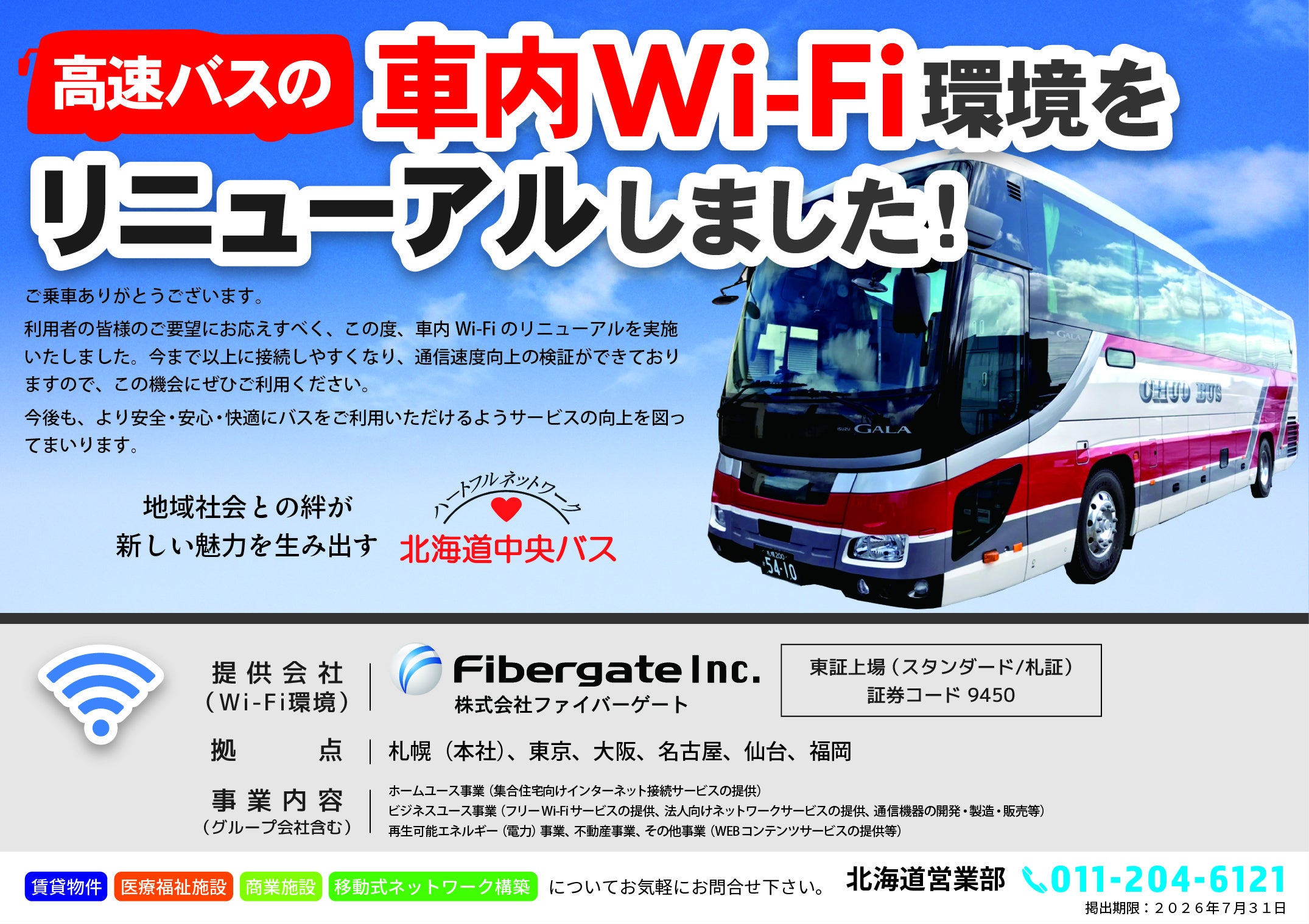 株式会社ファイバーゲート(東証スタンダード・札証:9450、本社:北海道札幌市、代表取締役社長執行役員:猪又 將哲、以下「ファイバーゲート」)は、北海道中央バス株式会社(札証:9085、本社:北海道小樽市、代表取締役社長:二階堂 恭仁、以下「北海道中央バス」)が運行する都市間高速バス約200台に対し、バス車内用Wi-Fiサービス「Wi-Fi BUS(R)」の提供を開始いたします。