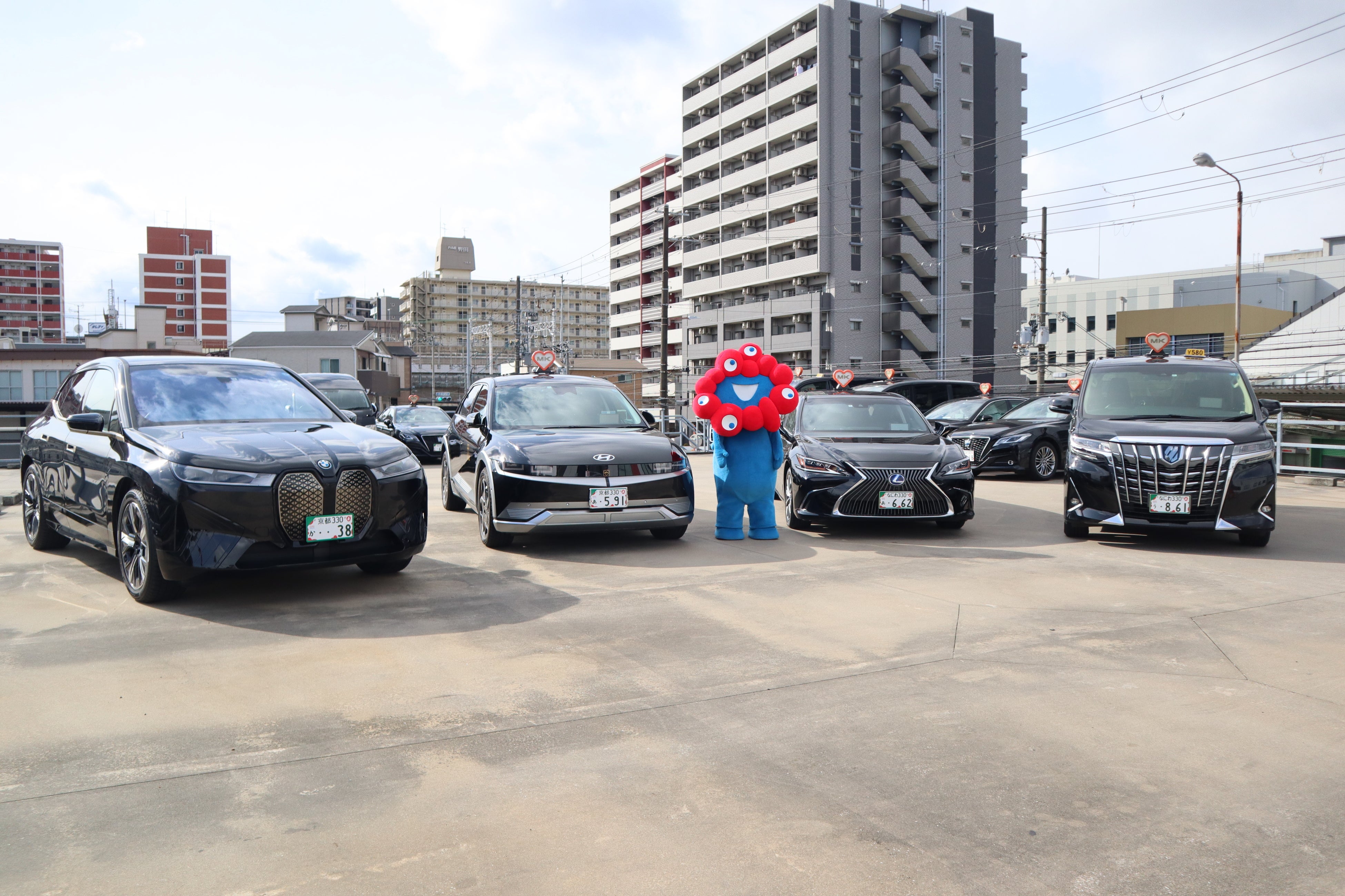 MKタクシー車両。写真は2023年1月24日の「EVに万博記念ナンバー装着」の記者発表にて撮影。万博のテーマである「持続的な未来」に合致する「2030年までに全車EV化」にも取り組んでいる。