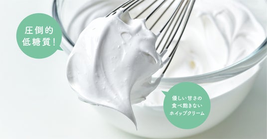 砂糖を使用せず、カロリーゼロでありながら砂糖と同じ甘さを持つ自然派甘味料「ラカント」を配合。ウリ科の植物「羅漢果(ラカンカ)」の高純度エキスと、天然甘味料成分である「エリスリトール」を絶妙なバランスで組み合わせ、砂糖に近い甘さを実現しました。さっぱりとした軽い口当たりで、最後まで食べ飽きない低糖質ホイップクリームです。