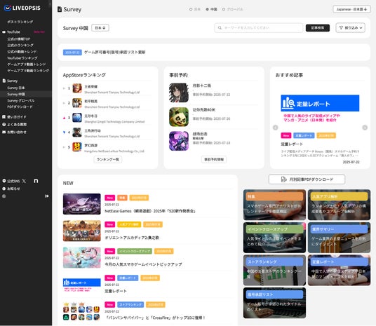 本レポートは、調査・分析事業の一環として中国市場におけるゲームタイトルの版号取得動向を毎月定点観測し、記録・分析しているものです。中国および海外ゲームタイトルの動向に加えて、注目作品や市場トレンドをいち早く把握できる内容となっており、スパイスマート提供の「LIVEOPSIS」会員企業に向けて定期配信中です。