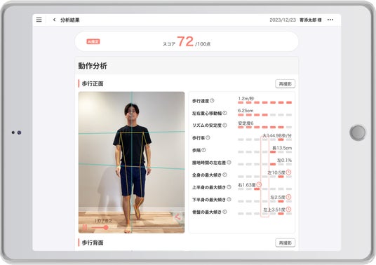 「カルティ シセイカルテ」は、タブレットで数枚の写真を撮影するだけでAIが姿勢を分析し、スコアやグラフで可視化するシステムです。健康経営やカウンセリングなど、さまざまな現場で活用が広がっています。さらに、歩行動画を撮影することで、歩行速度や歩幅、バランスなどの客観的な指標を数値化し、歩行スコアや転倒リスクの評価も可能です。