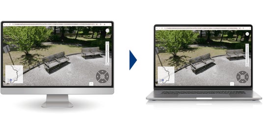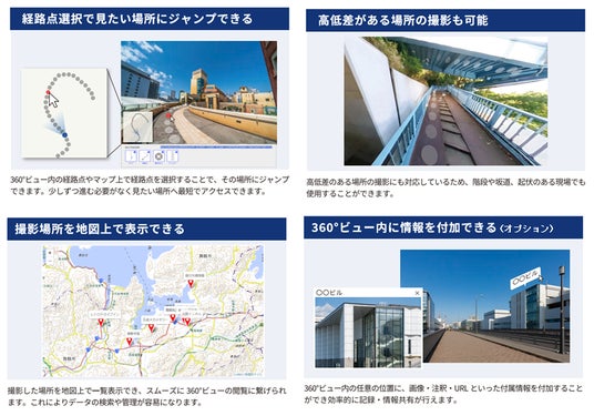 - 360°ビューの中に表示される経路点を選択して360°画像内を撮影経路に沿って移動できるほか、経路マップウィンドウの中から移動先を選択して移動でき、撮影された現場を空間的に体験することができます。また、URLリンク機能により360°ビュー内の注目点をインターネットを介して伝達することができます。