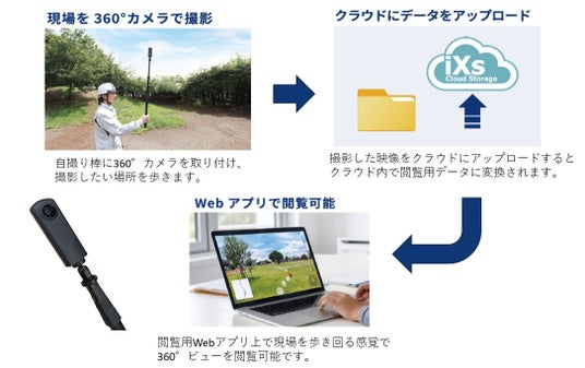 本サービスは、当社が提供する360°カメラと専用Webアプリを組み合わせたレンタルサービスです。従来の写真管理に替わり、360°カメラで現場を網羅的に撮影し記録することが可能です。撮影した画像は専用Webアプリで簡単に確認・共有することができ、現場の省力化・DX化に貢献します。