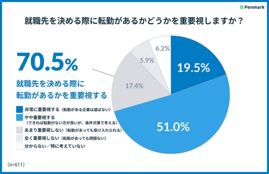 株式会社ペンマーク(本社:東京都目黒区、代表取締役:横山直明、以下ペンマーク)は、学生向け学習管理SNS「Penmark」(https://penmark.jp/) を利用している全国の現役大学生611名を対象に転勤に関するアンケート調査を実施しました。昨今、ライフスタイルの多様化や共働き世帯の増加により、転勤制度を見直す企業も増えつつあります。今回の調査からは、約7割の学生が就職先選びの際に「転勤の有無」を重視していることが明らかになり、実際に応募回避や内定辞退の判断材料としている実態も浮き彫りになりました。