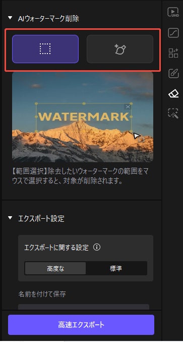 範囲選択・クリック選択状況という二つの選択方式が登場し、ウォーターマーク部分をクリックするだけでマスク座標を自動推定し、より精確なウォーターマーク除去を実現しています。