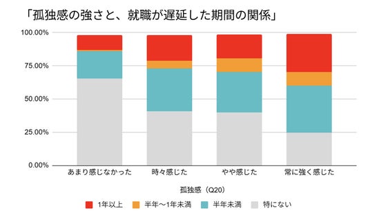 孤独感と失業期間をクロス集計した結果、孤独感を「あまり感じなかった」層で就職が1年以上遅れた人は11.2%でした。一方で、孤独感を「常に強く感じた」層では、その割合が28.6%へと約3倍に跳ね上がります(半年以上の遅れを含めると約40%)。