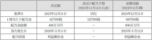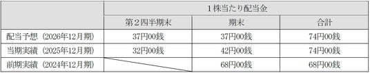 この基本方針に基づき、2025年12月期の期末配当金は、直近の配当予想から10円00銭増配し、1株当たり42円00銭の普通配当を実施することといたしました。なお、中間配当金(32円00銭)と合わせた2025年12月期の年間配当金は1株当たり74円00銭となります。