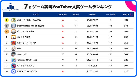 株式会社スパイスマートは、2025年7月におけるゲーム実況YouTuberが取り上げたスマホゲームのランキングをもとに、実況トレンドの分析調査を実施しました。