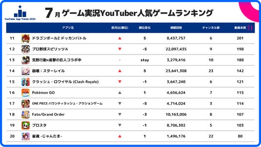 LIVEOPSIS|YouTuberが投稿したスマホゲームランキング(動画本数順11位~20位)/7月