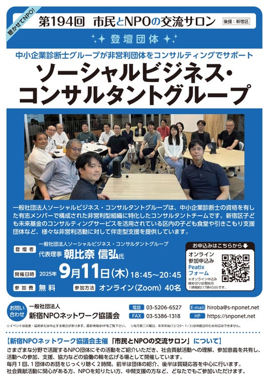 【第194回 市民とNPOの交流サロン:オンラインイベント】(登壇団体:一般社団法人 ソーシャルビジネス・コンサルタントグループ)を9月11日(木)に開催します!絶賛、参加者募集中です!!