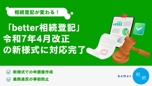 辻・本郷 ITコンサルティング株式会社(本社:東京都渋谷区、代表取締役社長:黒仁田 健)は、当社が提供しているクラウドサービス「better相続登記」において、令和7年4月21日以降申請用の新様式での申請書作成が可能となりましたので、お知らせいたします。