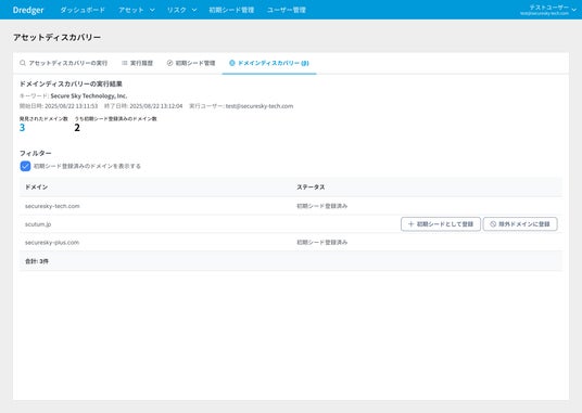 キーワード(英文組織名またはメールアドレス)をもとに、関連する初期シード相当のドメインを探索できる機能を追加しました。発見したドメインは初期シードとして登録でき、アセットディスカバリーの対象とすることでサブドメインを含むアセット探索が可能です。