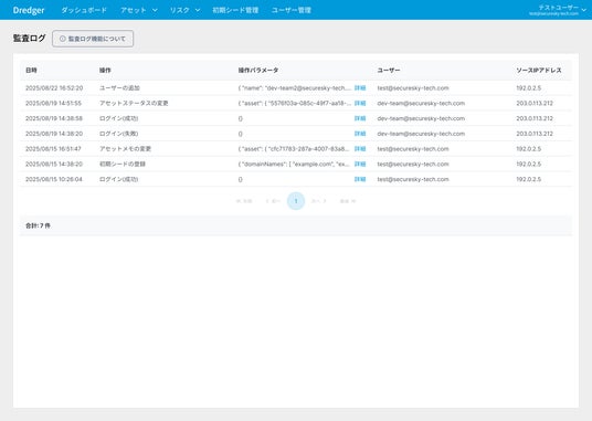 Dredger上におけるユーザー操作のログが記録される監査ログ機能を追加しました。今回のリリースでは、認証、ユーザー管理、初期シード管理、アセット管理に関連する操作が監査ログの記録対象です。今後も対象操作を順次拡大予定です。