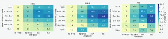 一般的に「駅に近いほど良い」と思われがちですが、相続においては少し異なる傾向が出ています。不動産の流動性に影響する駅からの距離を分析したところ、全国および首都圏・関西圏において、駅から「1km~2km」圏内の物件で相続後1年内の売買率が高まる傾向が見られました。