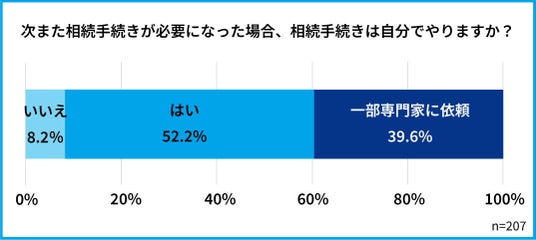 「次また相続手続きが必要になった場合、相続手続きは自分でやりますか?」と質問したところ、「はい」と答えた方が52.2%、「一部専門家に依頼」と答えた方が39.6%という結果になりました。