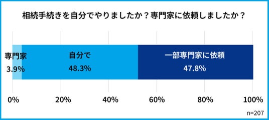 「相続手続きを自分でやりましたか?専門家に依頼しましたか?」と質問したところ、「自分で」が48.3%、「一部専門家に依頼」が47.8%という結果になりました。